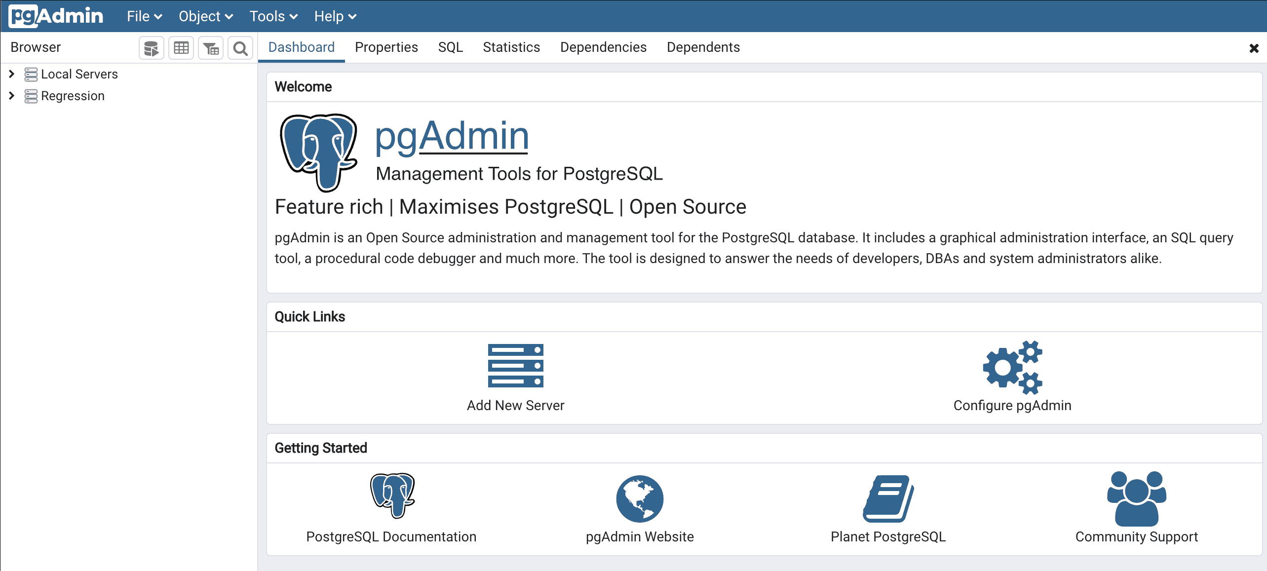 Zum Verwalten von PostgreSQL-Datenbanken wird, falls nicht bereits installiert, die Webanwendung pgAdmin installiert.